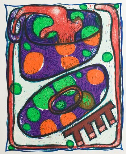 Woodcut printed in twelve colors from twelve blocks on Goyu mounted on Kochi in an edition of 42. 2000.